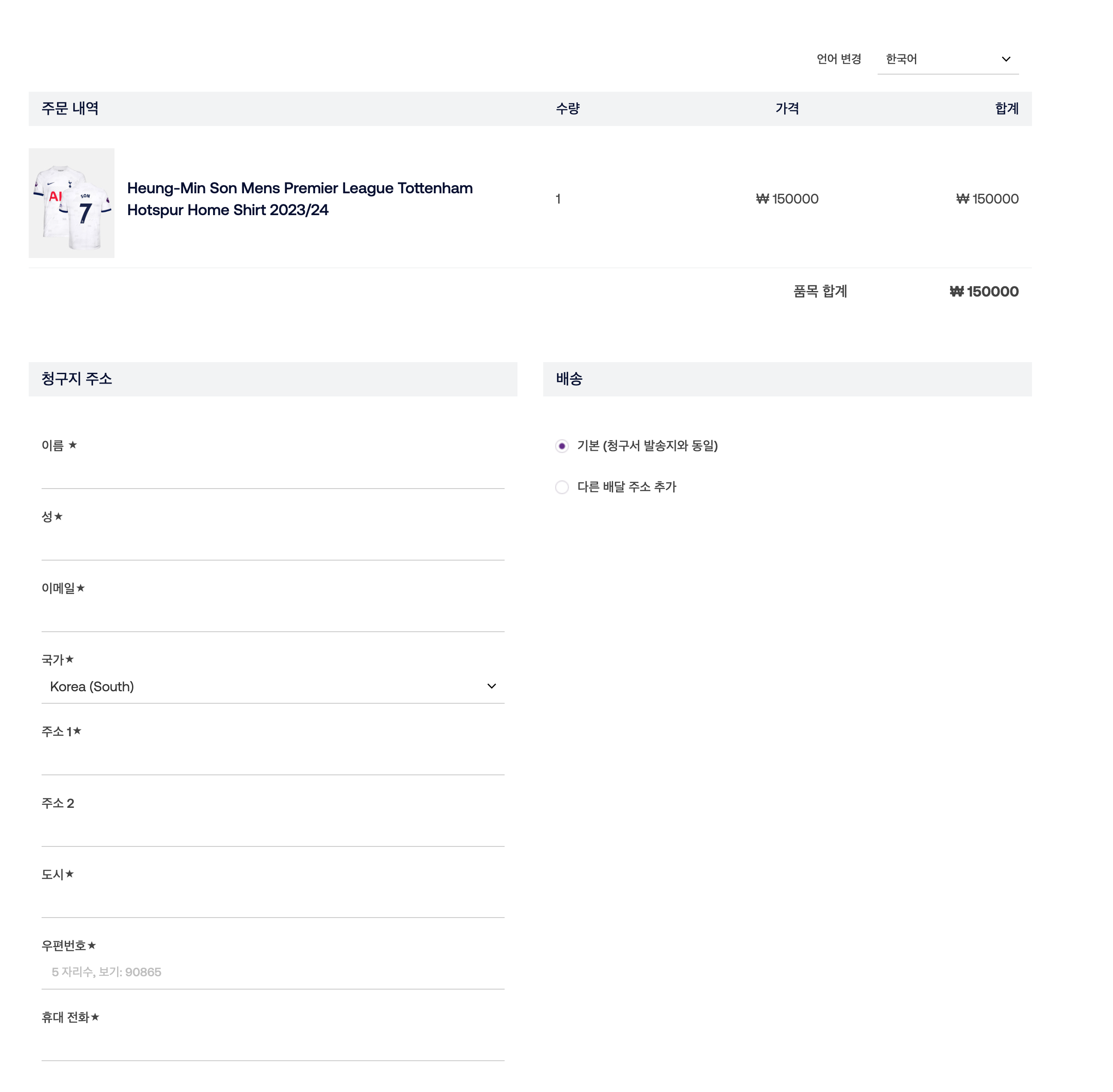 가장 중요한 결재 및 배송단계인데요. 손흥민 선수가 한국인이라서 한국어를 지원하고 있으니 걱정하지 않으셔도 됩니다. 거기다가 카카오페이로도 결재가 가능하고 직접배송하기 때문에 네이버에서 쇼핑하듯이 간단히 구매가 가능합니다.