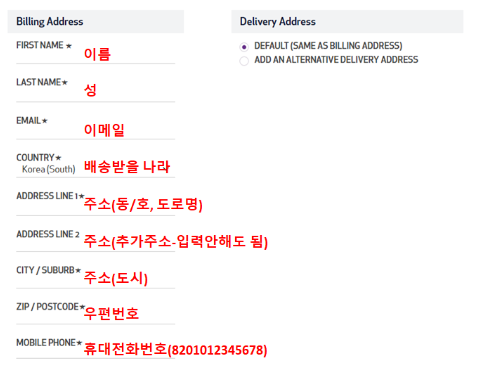 일단 우측 상단에 보시면 언어변경 메뉴가 있습니다. 여기서 '한국어'로 변경해주시고, 청구지 주소를 적으시면 됩니다. 주소1에 대부분 주소를 넣어시면되고, 주소2는 작성하지 않으셔도 됩니다.