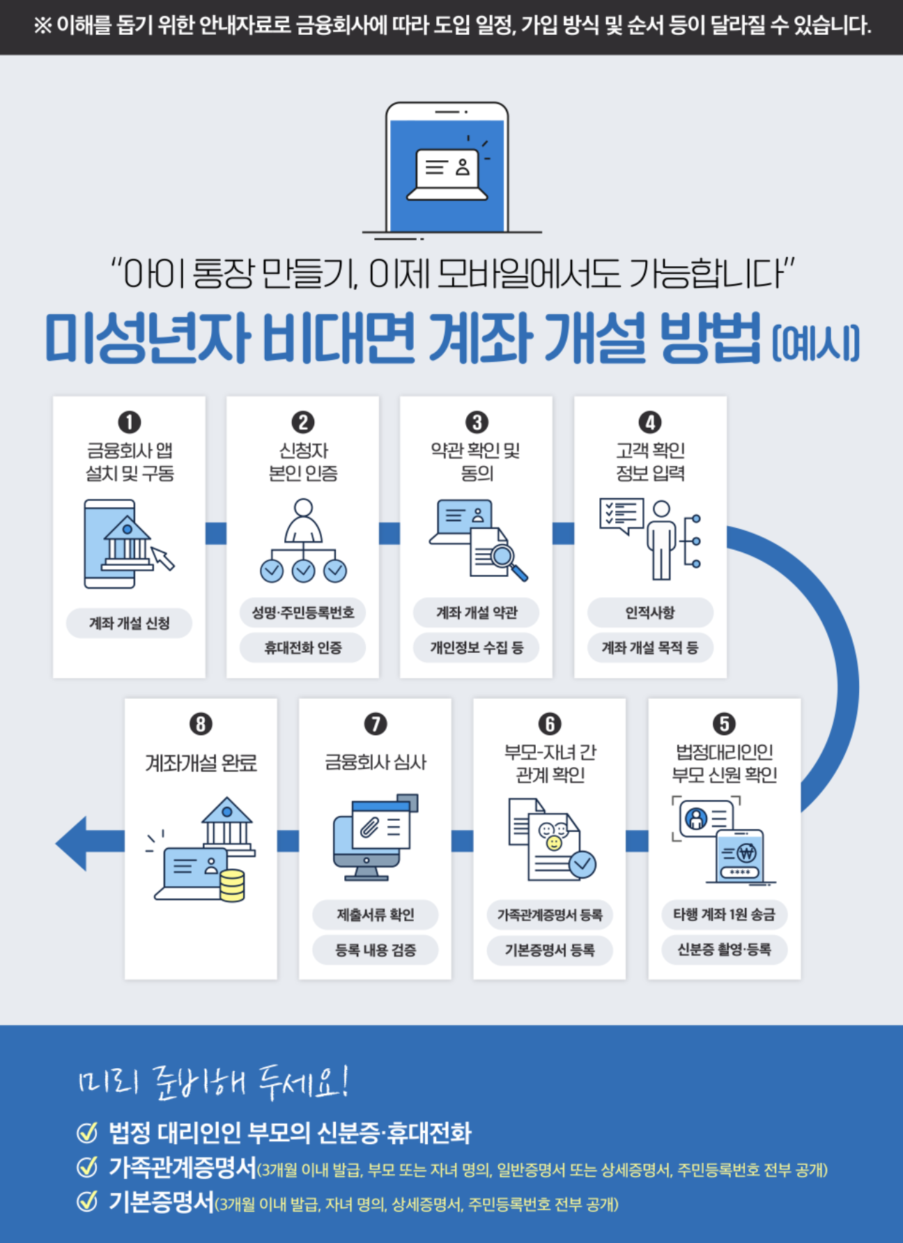 2023년 4월 '비대면 실명확인 가이드라인'을 개편하면서 부모님이 자녀명의의 계좌를 비대면으로 개설할 수 있게 되었습니다.